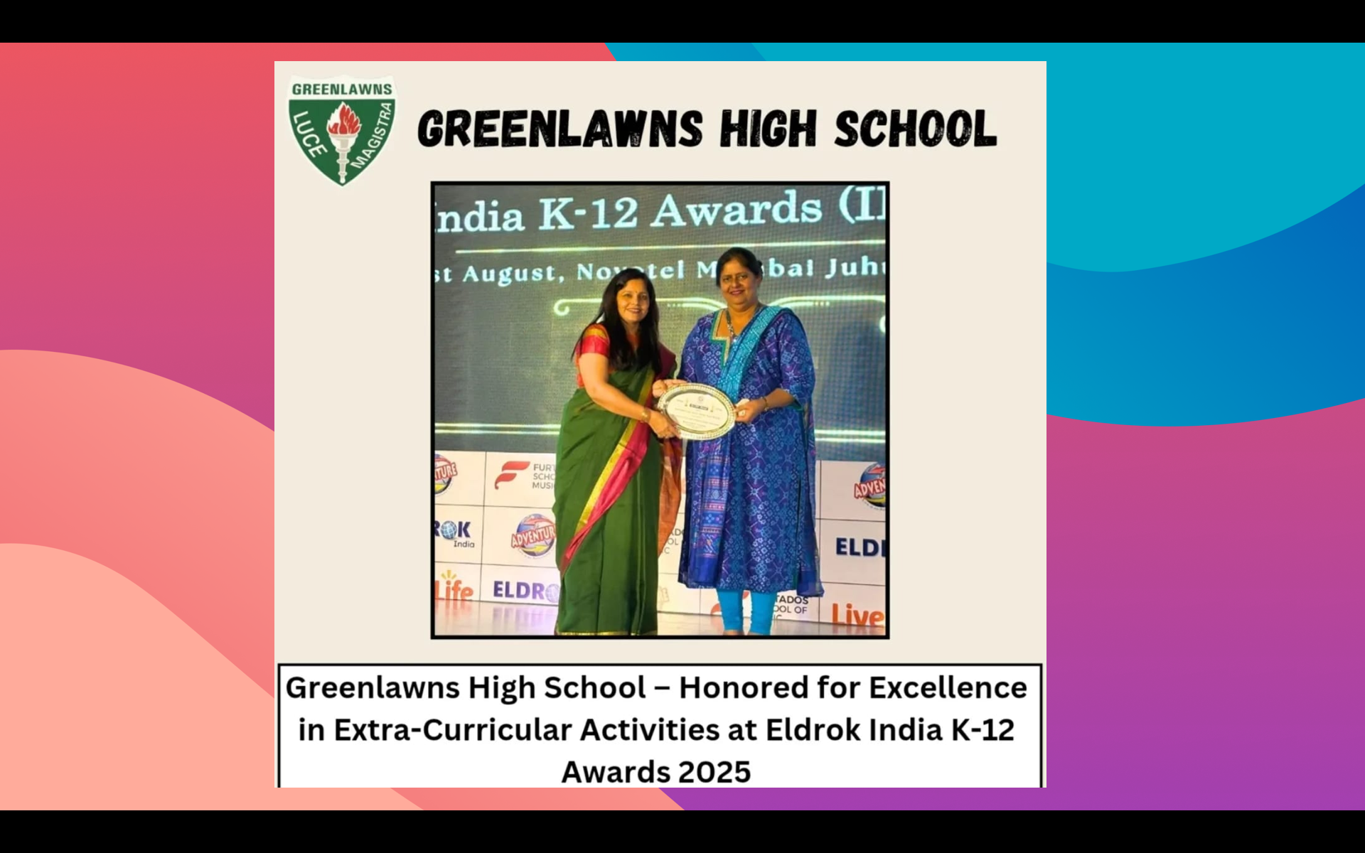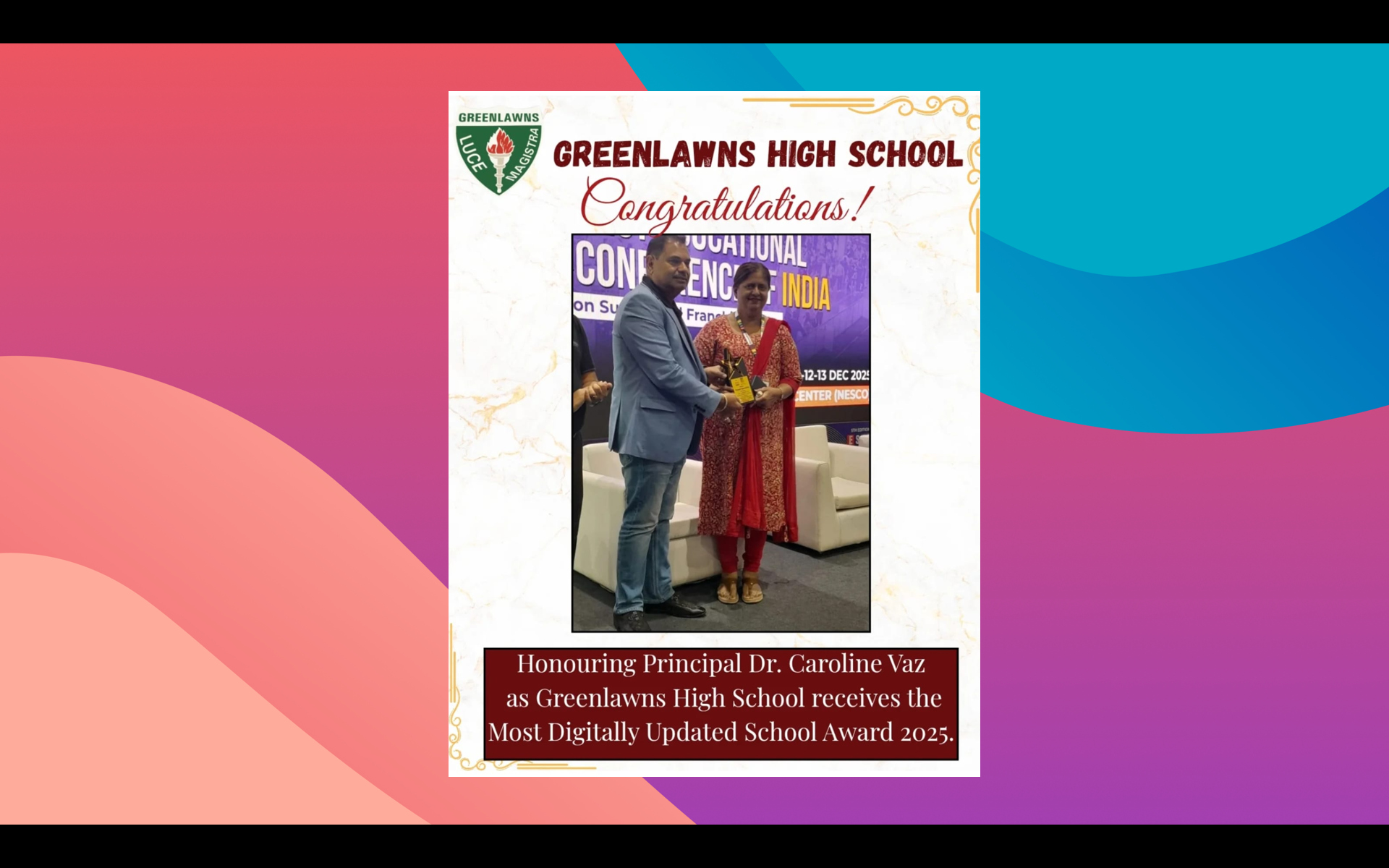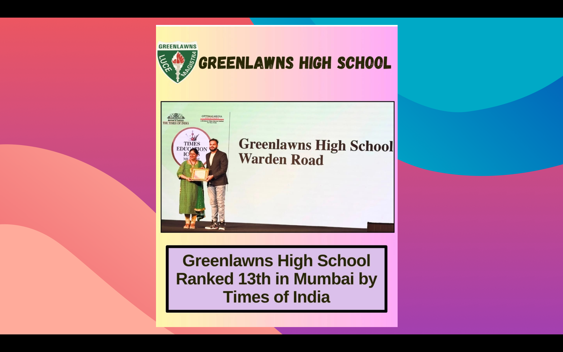 Last but not the least, may be Thank You is a very small word but yet it is coming deep from our heart. A big thank you to our school – Greenlawns High School-Warden Road, Our very keen Principal – Miss Caroline Vaz, our most experienced teacher and Backbone of Interschool Competition – Mrs Rita Murarka, our Creative Teacher Mrs Nivedita, the Digital World of our school – Mrs Sharon Carol, the Dance Master – Miss Kadambari, our Sports Coach – Sir Shekhar, our Master Chef – Mrs Amrita and of course all the teachers and team of GHS.